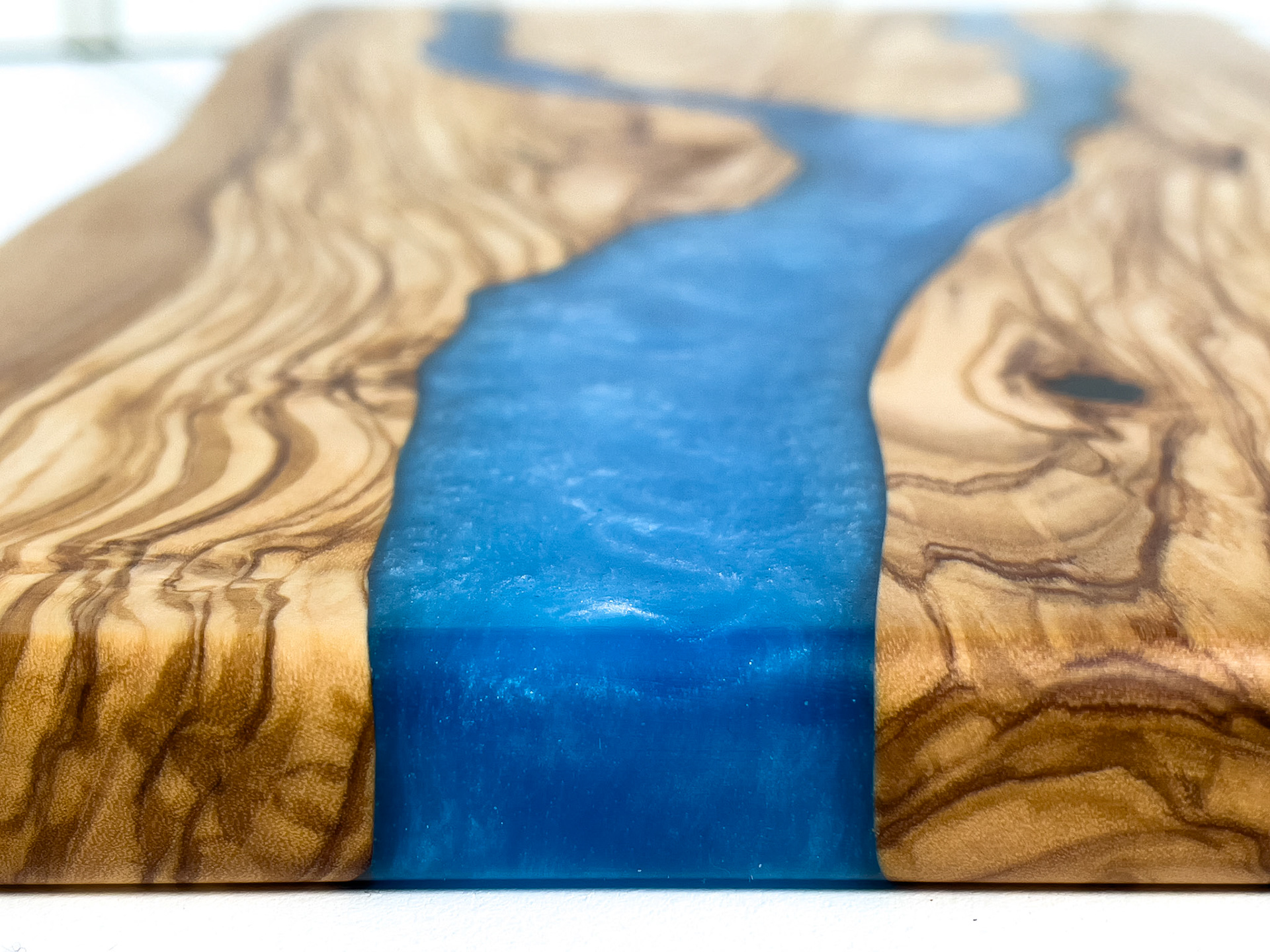Olive Wood Chopping Board / Charcuterie Board with blue resin 'river' and accent fills. Size:41cm*22cm*1.5cm