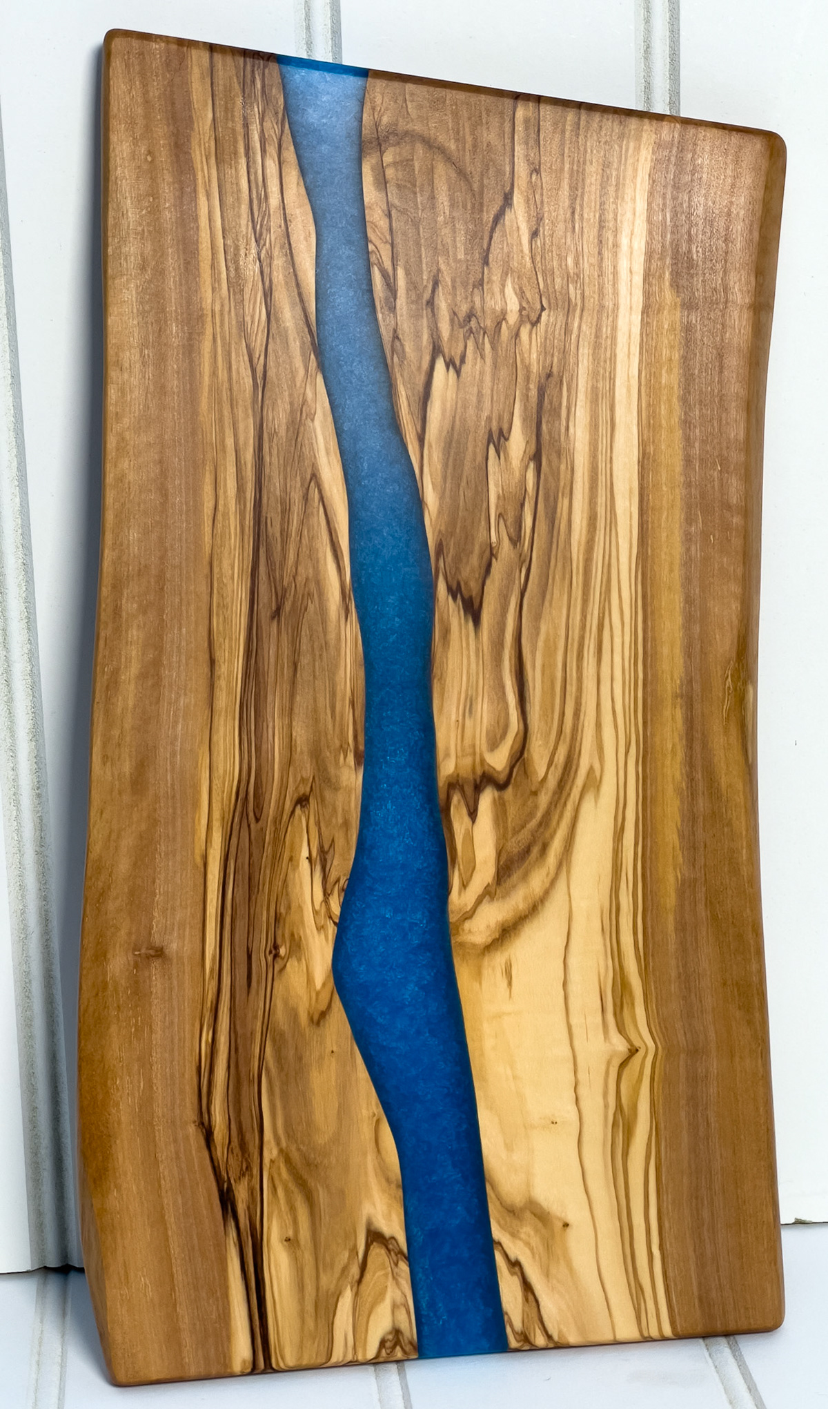 Olive Wood Chopping Board / Charcuterie Board with blue resin 'river' and black accent fills. Size:40cm*21cm*2cm