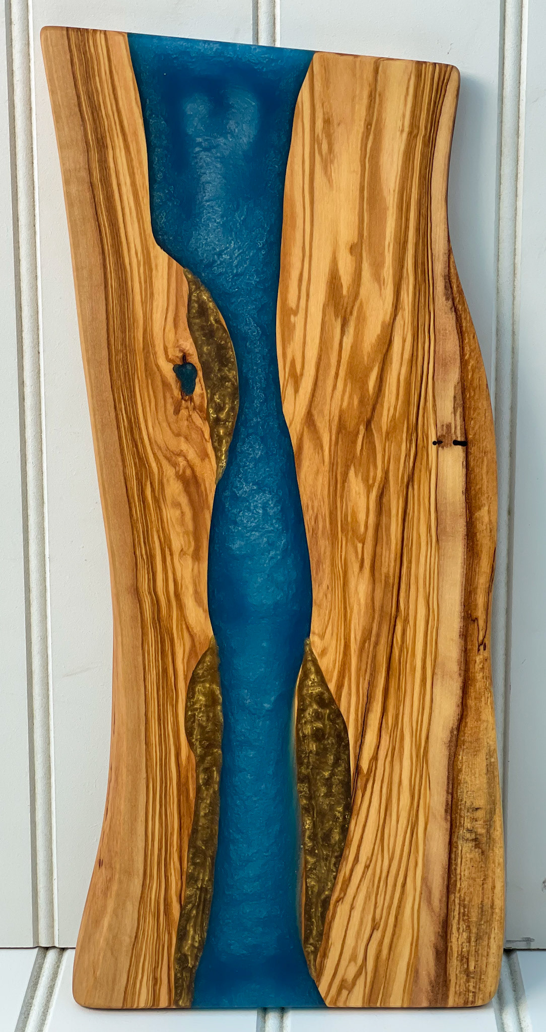 Olive Wood Chopping Board / Charcuterie Board with blue resin 'river' and gold infill. Size:41cm*18cm*1.3cm