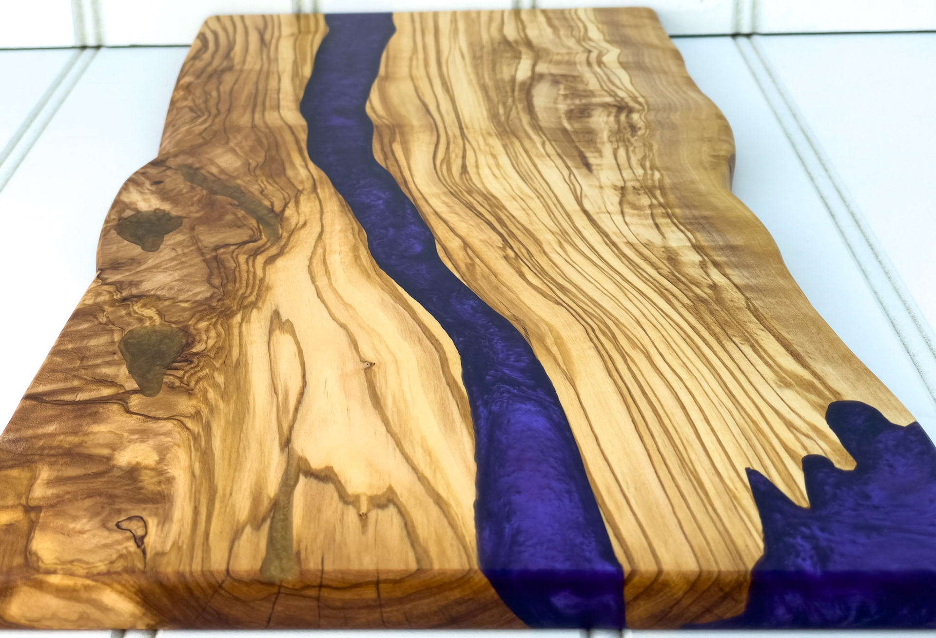 Olive Wood Chopping Board / Charcuterie Board with purple resin 'river', purple corner and gold infill. Size:41cm*23cm*1.50cm