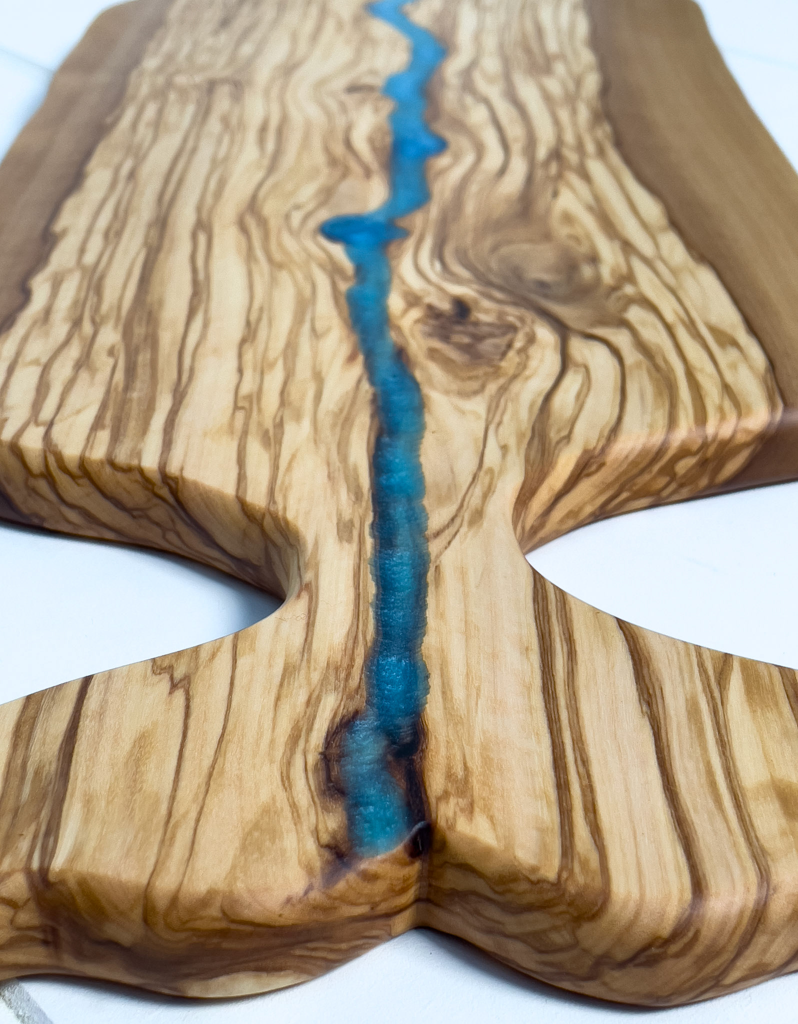 Olive Wood Chopping Board / Charcuterie Board with 'whale tail' handle and blue resin infill. Size:50cm*20cm*1.5cm