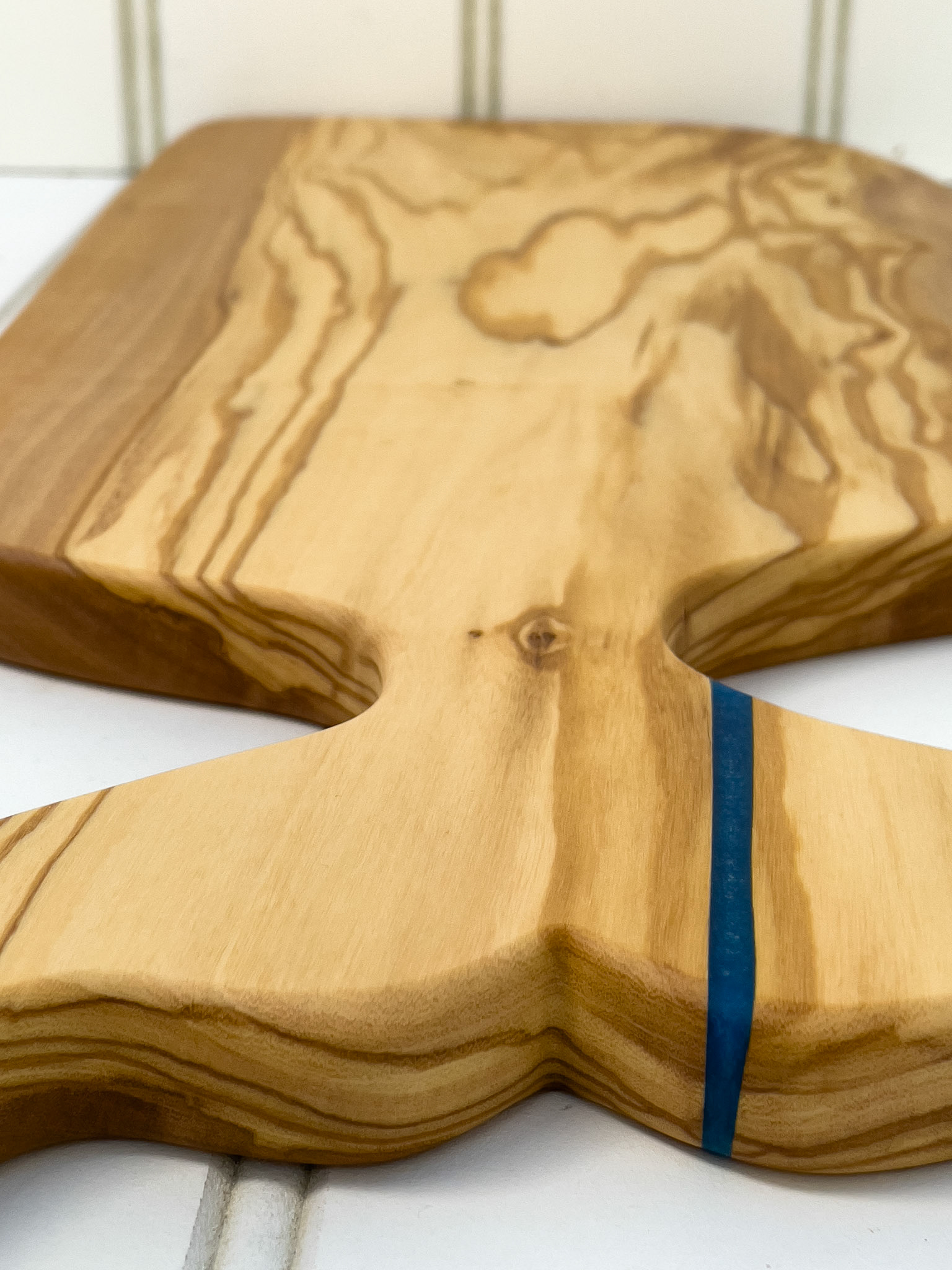Olive Wood Chopping Board / Charcuterie Board with 'whale tail' handle and blue resin infill. Size:48cm*22cm*1.5cm